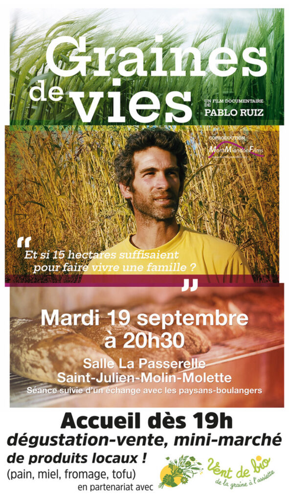 Projection du documentaire Graines de vie au Cinémolette de Saint-Julien-Molin-Molette, à 20h30, en présence de Damien, artisan-boulanger. La projection sera précédée d’un petit marché local à partir de 19h.