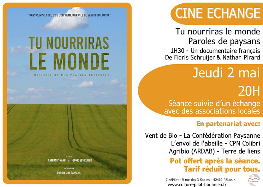 Vent de bio vous propose un ciné échange « Tu nourriras le monde » (quel qu’en soit le prix), jeudi 2 mai à 20h au Ciné-Pilat de Pélussin. Un documentaire français, suivi d’un pot et échanges avec des associations partenaires.