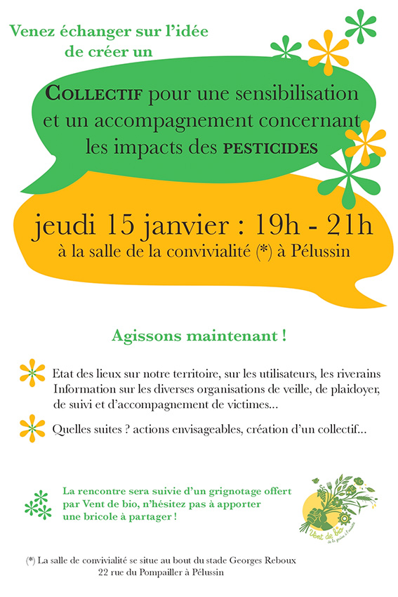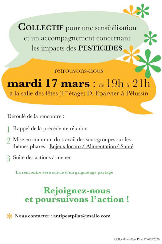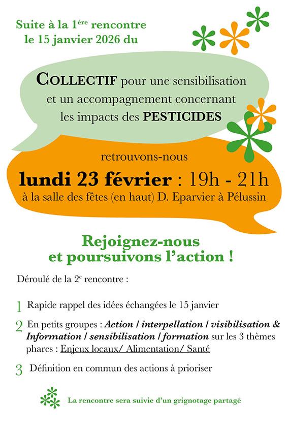 Jeudi 15 janvier 2026 à Pélussin avait lieu la 1ère rencontre pour une sensibilisation et un accompagnement concernant les impacts des pesticides, nous en relayons l’appel :