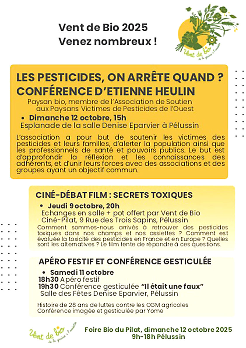 • Jeudi 9 octobre 20h au CinéPilat à Pélussin : SECRETS TOXIQUES > Comment sommes-nous arrivés à retrouver des pesticides toxiques dans nos champs et nos assiettes ? Comment est évaluée la toxicité des pesticides en France et en Europe ? Quelles sont les alternatives ?