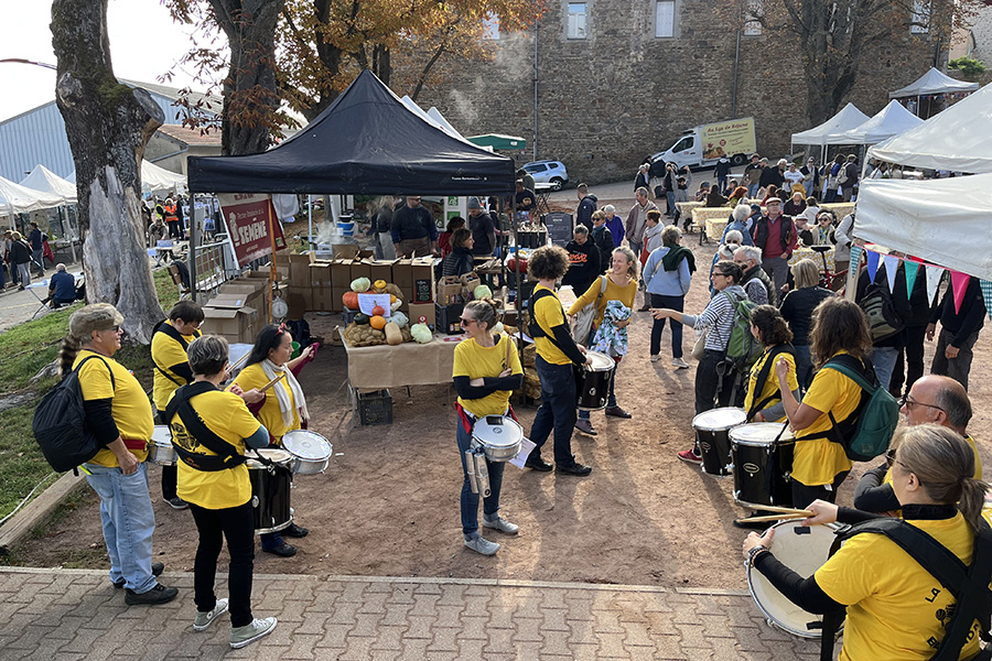 • En début de marché, La Batucada de l’École de musique de Pélussin éveille la foire.